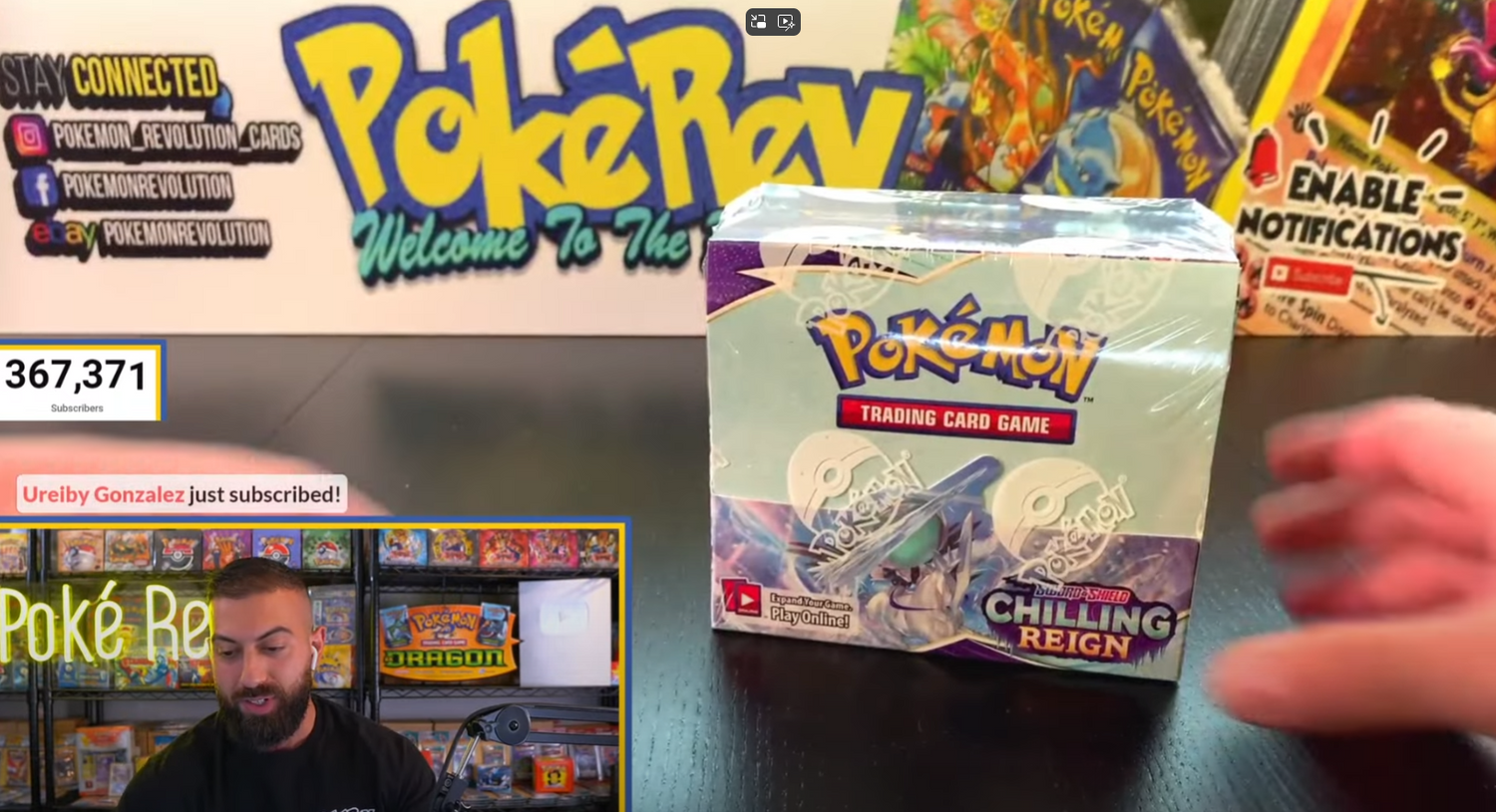 Fast forward naar 2021. De wereld zat op slot, wij ook – na 21:00 mocht niemand nog naar buiten. Alle games uitgespeeld, YouTube-video’s al twee keer bekeken… Totdat ineens een gast genaamd PokéREV in zijn rommelige garage begon te praten over een paar toffe kaarten uit Chilling Reign. Dat zag er wel interessant uit! “Laat ik ook eens een booster box kopen,” dacht ik.
